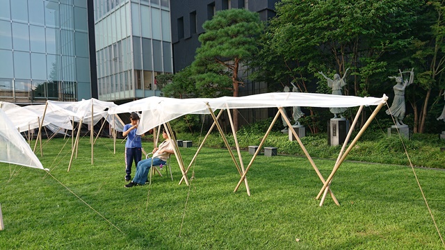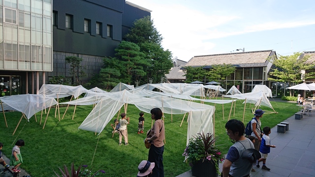 美術館中庭でそれぞれ思い思いにインスタント建築を楽しみました。