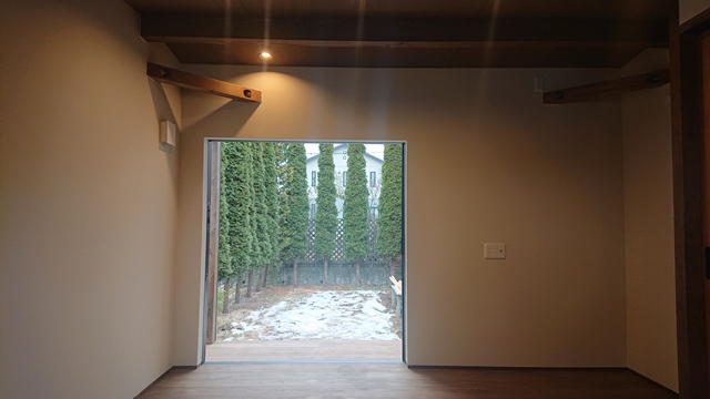 軒裏のダウンライトが少々浮いているので、調整が必要。