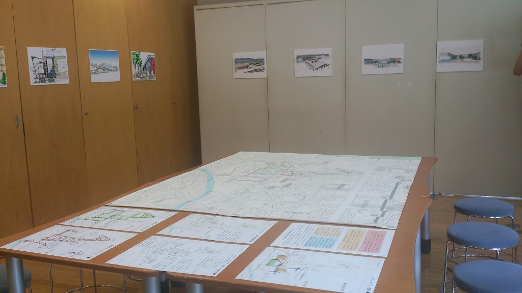 『まち』と繋がる回遊性のある計画案が描かれ、壁面には手描きのパース。