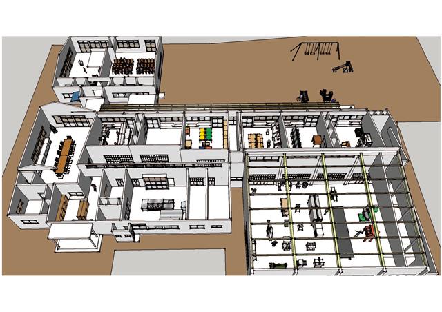 中庭を介して東・南・西側に工場棟の配置となっています。
