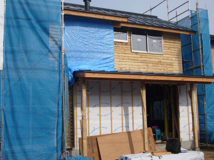外壁の下地、開口部サッシュの取り付け工事がほぼ完了しました。