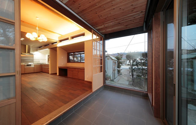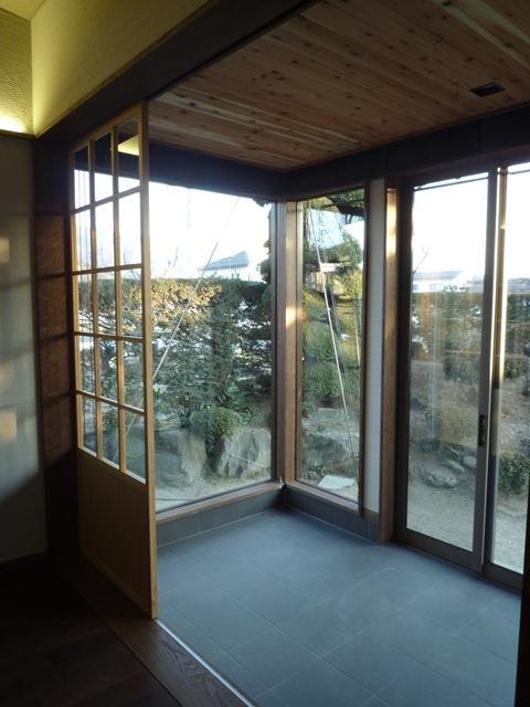 押入部分と外壁そして床を撤去して、床にはタイルを貼り、撤去した外壁部分は木製の筋違の代わりに、鋼製の筋違を入れ複層ガラスをはめ込みました。