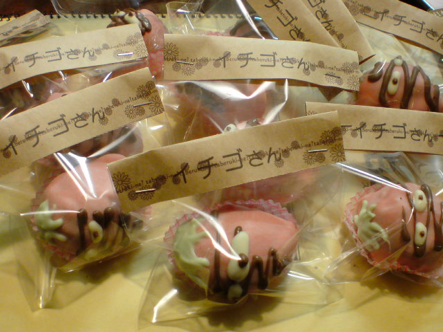 ライスパフとアーモンド、マシュマロをミルクチョコで苺の形にまとめたモのを芯にしてイチゴチョコでコーティング、へたはチョコペン、目はホワイトチョコで、ラッピングバック用にタグも作って完成です。