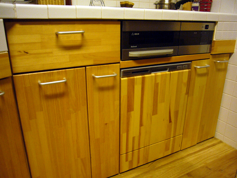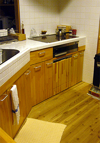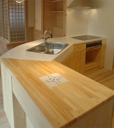 パインの集成材を使い、ワークトップは100角のタイル。