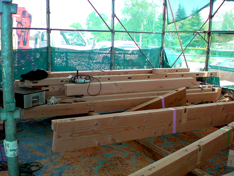 加工場では大工さんが柱や梁を手作業で加工しています。