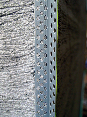 左官用の定規を出隅部分に取り付けて、モルタルを塗っていきます。