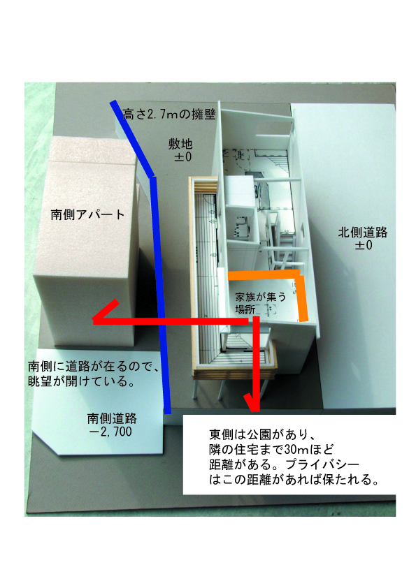 敷地南側のアパートを屋内から感じさせない事、また南側の開放的な部分を屋内に取り込めないか?