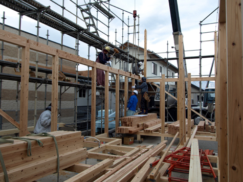 1階の柱を建てて、2階胴差を柱の臍へ落として加構を組上げていきます。