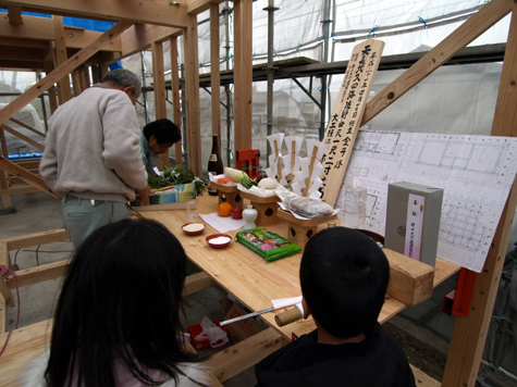 棟梁に祝詞を上げてもらい、皆で上棟のお祝いをしました。