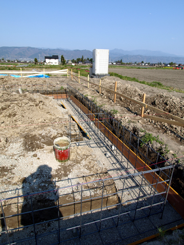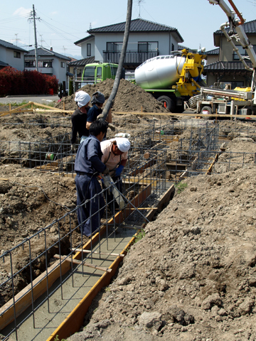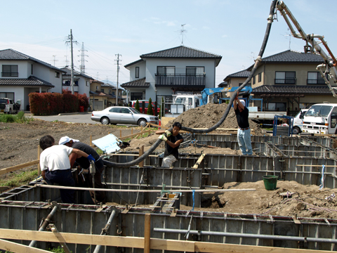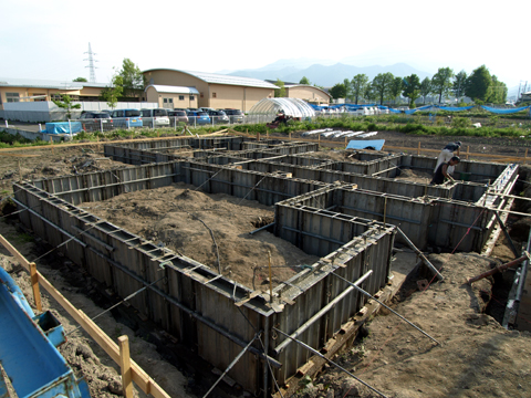 コンクリートの硬化後、型枠を外して埋め戻し作業・土間や床下の施工へと進みます。