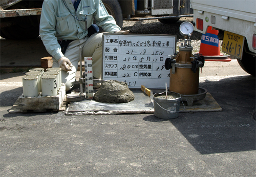 検査は図面に記載されているコンクリートのスランプや空気量の測定