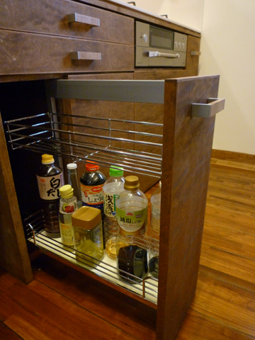 この収納には、電子レンジとトースターも収納してあります。